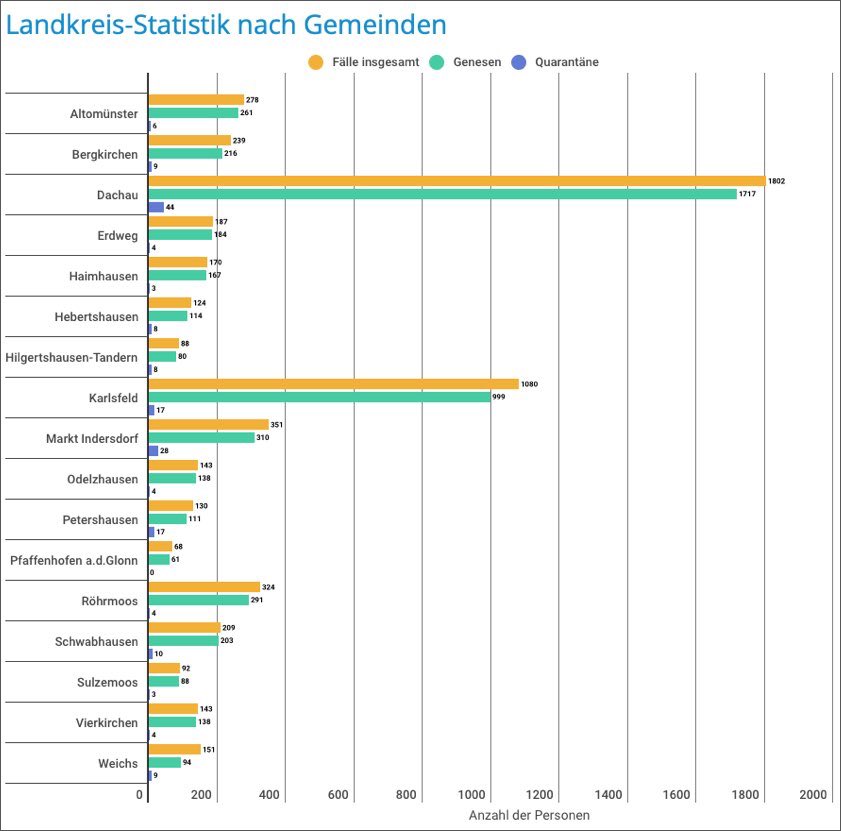 (ty) Im Kreis Dachau stellt sich die Corona-Situation laut heutiger Mitteilung des Landratsamts (Stand: 16.30 Uhr) derzeit wie folgt dar: Heute wurden dem hiesigen Gesundheitsamt 18 Neuinfektionen im Landkreis gemeldet. Insgesamt gibt es damit bislang 5579 bestätigte Infektionen. 5172 der positiv auf den Erreger getesteten Personen gelten mittlerweile als genesen, 296 Personen aktuell als infiziert. 111 Landkreis-Bürger, die mit dem Virus infiziert waren, sind gestorben. 180 Landkreis-Bürger befinden sich momentan in häuslicher Quarantäne. Die Sieben-Tages-Inzidenz, umgerechnet auf 100 000 Menschen, wird für den Kreis Dachau mit 67,8 angegeben. Zahlen aus den einzelnen Gemeinden zeigt die Tabelle unten.