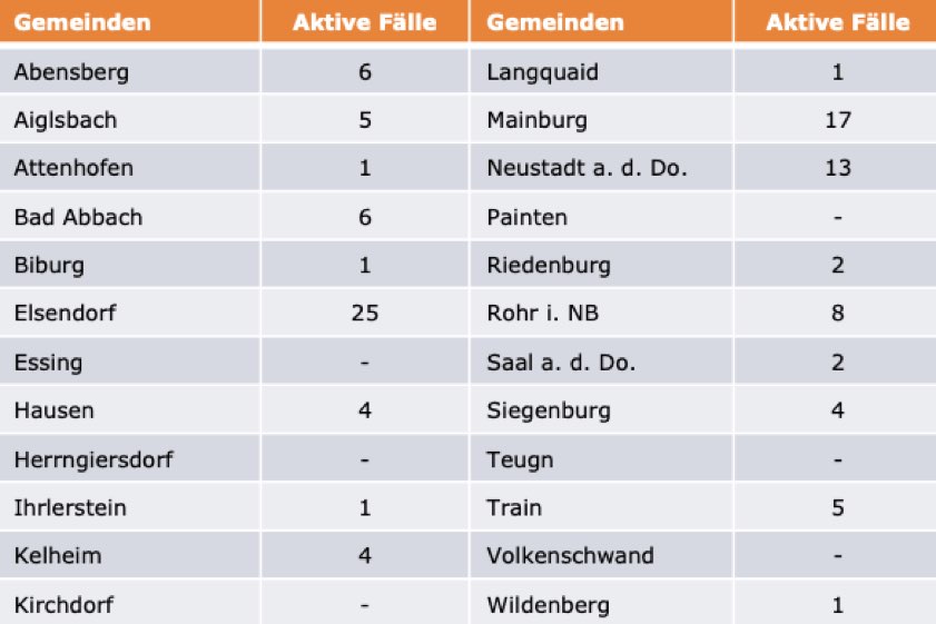 (ty) Im Kreis Kelheim gibt es in Zusammenhang mit der Corona-Pandemie, wie berichtet, mittlerweile 75 Menschenleben zu beklagen. Unter Verweis auf Daten der Behörde teilte das Landratsamt heute mit, dass – Stand gestern, 16 Uhr – die Zahl der im Kreis Kelheim positiv auf den neuartigen Erreger getesteten Menschen bei insgesamt 3135 liegt – das sind zwölf mehr als gestern gemeldet. 2954 hiesige Corona-Patienten (gestern: 2948) gelten mittlerweile als genesen und sind aus der Quarantäne entlassen. Derzeit gibt es 106 aktive Corona-Fälle im Landkreis (gestern: 100). Zahlen aus den einzelnen Gemeinden zeigt die Tabelle unten.
