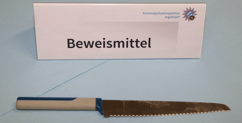 Sofort wurden umfangreiche Fahndungs-Maßnahmen gestartet. Neben zahlreichen Streifenwagen – auch von umliegenden Polizei-Dienststellen – waren, wie berichtet, auch Personen-Suchhunde sowie ein Polizei-Hubschrauber im Einsatz. Im Rahmen der Fahndung sei noch in der Nacht der 26-Jährige aus dem Kreis Neuburg-Schrobenhausen gefasst worden. "Bei der Durchsuchung seiner Wohnung konnte umfangreiches Beweis-Material, darunter auch die mutmaßlich bei der Tat verwendete Waffe (Foto unten), aufgefunden und sichergestellt werden", wurde am heutigen Nachmittag erklärt.