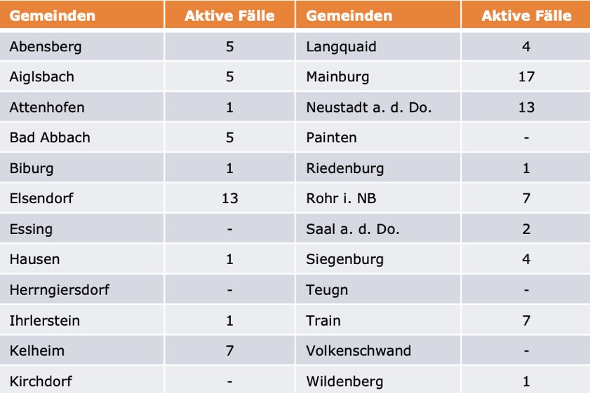 (ty) Im Kreis Kelheim gibt es in Zusammenhang mit der Corona-Pandemie, wie berichtet, mittlerweile 75 Menschenleben zu beklagen. Unter Verweis auf Daten der Behörde teilte das Landratsamt heute mit, dass – Stand gestern, 16 Uhr – die Zahl der im Kreis Kelheim positiv auf den neuartigen Erreger getesteten Menschen bei insgesamt 3145 liegt – das sind zehn mehr als gestern gemeldet. 2975 hiesige Corona-Patienten (gestern: 2954) gelten mittlerweile als genesen und sind aus der Quarantäne entlassen. Derzeit gibt es 95 aktive Corona-Fälle im Landkreis (gestern: 106). Zahlen aus den einzelnen Gemeinden zeigt die Tabelle unten.