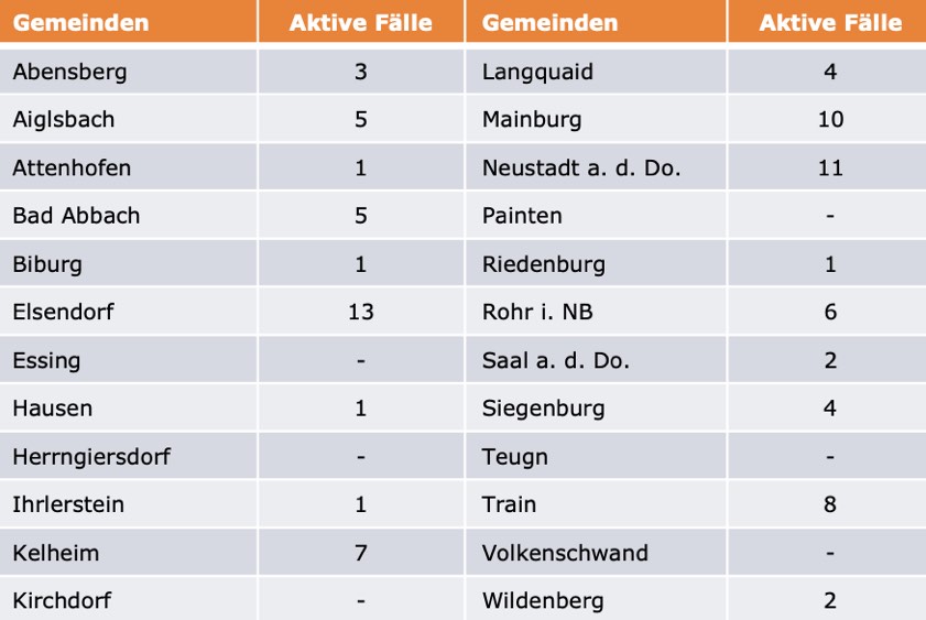 (ty) Im Kreis Kelheim gibt es in Zusammenhang mit der Corona-Pandemie, wie berichtet, mittlerweile 75 Menschenleben zu beklagen. Unter Verweis auf Daten der Behörde teilte das Landratsamt heute mit, dass – Stand gestern, 16 Uhr – die Zahl der im Kreis Kelheim positiv auf den neuartigen Erreger getesteten Menschen bei insgesamt 3148 liegt – das sind drei mehr als gestern gemeldet. 2988 hiesige Corona-Patienten (gestern: 2975) gelten mittlerweile als genesen und sind aus der Quarantäne entlassen. Derzeit gibt es 85 aktive Corona-Fälle im Landkreis (gestern: 95). Zahlen aus den einzelnen Gemeinden zeigt die Tabelle unten.