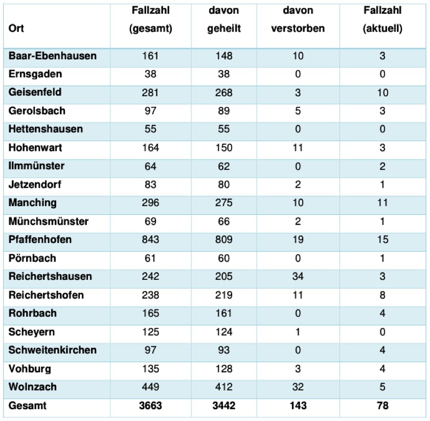 Von den bislang insgesamt 3663 Menschen aus dem Kreis Pfaffenhofen, bei denen nach jüngstem offiziellen Stand eine Corona-Infektion bestätigt worden ist, gelten laut aktueller Mitteilung der Behörde mittlerweile 3442 als genesen – das sind 31 mehr als am Freitag gemeldet. Die Zahl der Infizierten und noch nicht genesenen Corona-Patienten hat sich damit im Landkreis verringert und beträgt – Stand: heute Nachmittag – nunmehr 78 (Freitag: 92). Die infizierten Personen befinden sich in häuslicher Isolation.