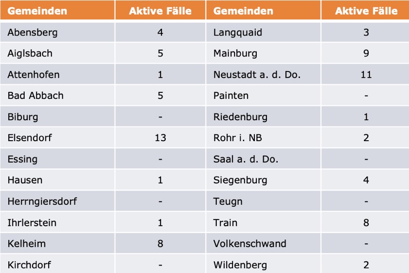 (ty) Im Kreis Kelheim gibt es in Zusammenhang mit der Corona-Pandemie ein weiteres Menschenleben zu beklagen. Wie das Landratsamt gegenüber unserer Redaktion mitteilte, ist eine mit dem Erreger infizierte Frau (Jahrgang 1932) gestorben, die unter Vorerkrankungen litt. Damit erhöht sich die Zahl der infizierten Landkreis-Bürger, die gestorben sind, auf nunmehr 76. Unter Verweis auf Daten des Gesundheitsamts teilte das Landratsamt heute mit, dass – Stand gestern, 16 Uhr – die Zahl der im Kreis Kelheim positiv auf den neuartigen Erreger getesteten Menschen bei insgesamt 3152 liegt – das sind vier mehr als gestern gemeldet. 2998 hiesige Corona-Patienten (gestern: 2988) gelten mittlerweile als genesen und sind aus der Quarantäne entlassen. Derzeit gibt es 78 aktive Corona-Fälle im Landkreis (gestern: 85). Zahlen aus den einzelnen Gemeinden zeigt die Tabelle unten.