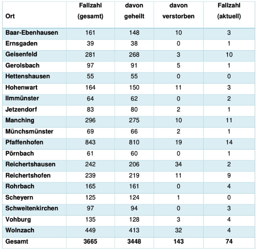 Von den bislang insgesamt 3665 Menschen aus dem Kreis Pfaffenhofen, bei denen nach jüngstem offiziellen Stand eine Corona-Infektion bestätigt worden ist, gelten laut aktueller Mitteilung der Behörde mittlerweile 3448 als genesen – das sind sechs mehr als gestern gemeldet. Die Zahl der Infizierten und noch nicht genesenen Corona-Patienten hat sich damit im Landkreis verringert und beträgt – Stand: heute Vormittag – nunmehr 74 (gestern: 78). Die infizierten Personen befinden sich in häuslicher Isolation.
