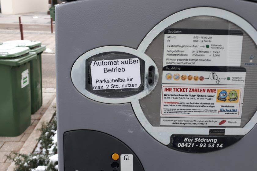 (ty) Bislang noch unbekannte Täter haben in der Eichstätter Innenstadt zahlreiche Parkschein-Automaten mit Hinweis-Schildern versehen und auf diese Weise sozusagen außer Betrieb gesetzt. Die Beamten von der örtlichen Polizeiinspektion berichten heute von diesem ungewöhnlichen Fall und ermitteln jetzt wegen Amtsanmaßung. Um Zeugen-Hinweise wird in diesem Zusammenhang gebeten: Sachdienliche Angaben zum Urheber dieser strafrechtlich relevanten Aktion werden unter der Telefonnummer (0 84 21) 9 77 0-0 entgegengenommen.