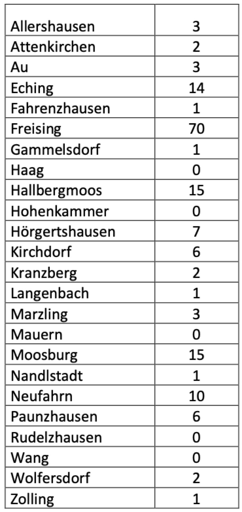 Im Kreis Freising sind bislang insgesamt 5346 Personen (Stand: heute, 12 Uhr) positiv auf das Corona-Virus getestet worden. 4992 der Betroffenen gelten mittlerweile als genesen. 104 Landkreis-Bewohner, die mit dem Erreger infiziert waren, sind gestorben. Die Sieben-Tages-Inzidenz umgerechnet auf 100 000 Einwohner beträgt nach Angaben des Robert-Koch-Instituts (RKI) für den Kreis Freising momentan 68,3. Laut Landratsamt haben bislang 4858 Landkreis-Bewohner die erste Corona-Impfung erhalten, 2531 Leute haben bereits zwei Impfungen gegen den Erreger bekommen.