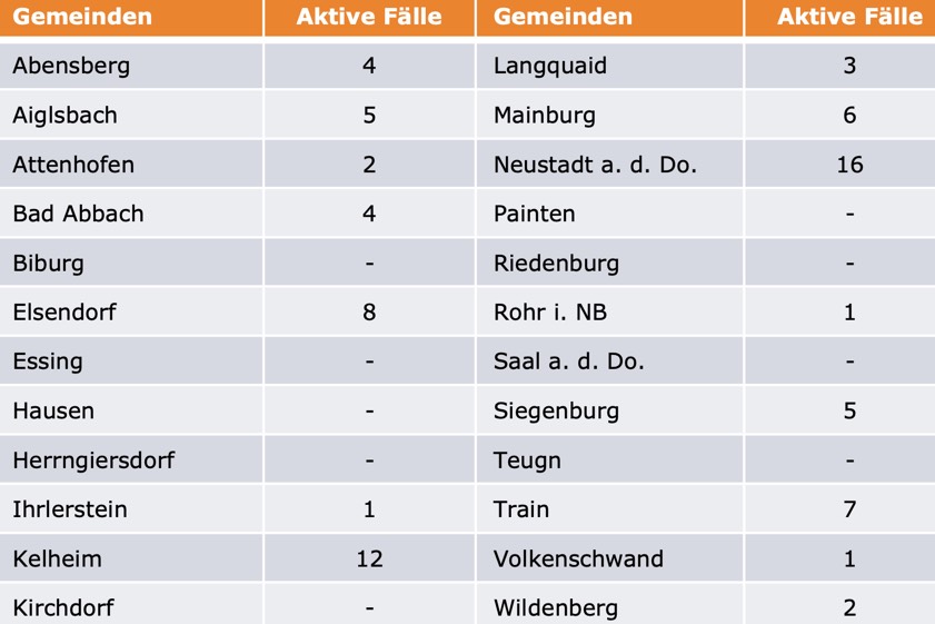 (ty) Im Kreis Kelheim gibt es in Zusammenhang mit der Corona-Pandemie, wie berichtet, mittlerweile 82 Menschenleben zu beklagen. Unter Verweis auf Daten des hiesigen Gesundheitsamts teilte das Landratsamt heute mit, dass – Stand gestern, 16 Uhr – die Zahl der im Kreis Kelheim positiv auf den neuartigen Erreger getesteten Menschen bei insgesamt 3181 liegt – das sind vier mehr als gestern gemeldet. Insgesamt 3022 hiesige Corona-Patienten (gestern: 3017) gelten mittlerweile als genesen und sind aus der Quarantäne entlassen. Derzeit gebe es 77 aktive Corona-Fälle im Landkreis Kelheim (gestrige Meldung: 78). Zahlen aus den einzelnen Gemeinden zeigt die Tabelle unten.