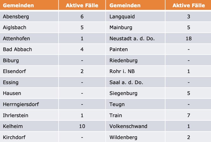 (ty) Im Kreis Kelheim gibt es in Zusammenhang mit der Corona-Pandemie ein weiteres Menschenleben zu beklagen. Wie das Landratsamt gegenüber unserer Redaktion erklärte, ist eine mit dem Erreger infizierte Frau (Jahrgang 1944) gestorben, die unter Vorerkrankungen litt. Damit erhöht sich die Zahl der mit dem Virus infizierten Landkreis-Bewohner, die gestorben sind, auf nunmehr 83. Unter Verweis auf Daten des hiesigen Gesundheitsamts teilte das Landratsamt heute mit, dass – Stand heute, 0 Uhr – die Zahl der im Kreis Kelheim positiv auf den neuartigen Erreger getesteten Menschen bei insgesamt 3190 liegt – das sind neun mehr als gestern gemeldet. Insgesamt 3036 hiesige Corona-Patienten (gestern: 3022) gelten mittlerweile als genesen und sind aus der Quarantäne entlassen. Derzeit gebe es 71 aktive Corona-Fälle im Landkreis Kelheim (gestrige Meldung: 77). Zahlen aus den einzelnen Gemeinden zeigt die Tabelle unten.