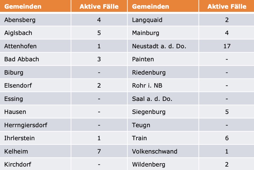 (ty) Im Kreis Kelheim gibt es in Zusammenhang mit der Corona-Pandemie, wie berichtet, mittlerweile 83 Menschenleben zu beklagen. Unter Verweis auf Daten des hiesigen Gesundheitsamts teilte das Landratsamt heute mit, dass – Stand heute, 0 Uhr – die Zahl der im Kreis Kelheim positiv auf den neuartigen Erreger getesteten Menschen bei insgesamt 3191 liegt – das ist einer mehr als gestern gemeldet. Insgesamt 3048 hiesige Corona-Patienten (gestern: 3036) gelten mittlerweile als genesen und sind aus der Quarantäne entlassen. Derzeit gebe es 60 aktive Corona-Fälle im Landkreis Kelheim (gestrige Meldung: 71). Zahlen aus den einzelnen Gemeinden zeigt die Tabelle unten.