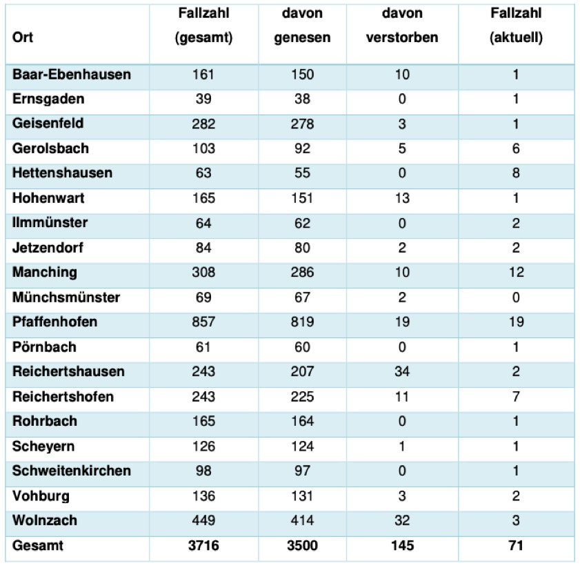(ty) In Zusammenhang mit der Corona-Pandemie gibt es im Kreis Pfaffenhofen zwei weitere Menschenleben zu beklagen. Wie das Landratsamt gegenüber unserer Zeitung mitteilte, sind übers Wochenende ein 54-jähriger Mann aus Hohenwart und eine 81-jährige Frau aus Hohenwart gestorben, die mit dem Erreger infiziert waren. Damit erhöht sich die Zahl der infizierten Landkreis-Bürger, die gestorben sind, auf 145. Das Landratsamt veröffentlicht eine tägliche Übersicht (siehe unten), in welchen Gemeinden die mit dem Virus infizierten Menschen, die gestorben sind, gelebt haben beziehungsweise wie viele bestätigte Infektionsfälle und genesene Patienten es in welcher Kommune gibt. Die Zahl der Landkreis-Bürger, die positiv auf den neuartigen Erreger getestet worden sind, hat sich seit der Meldung vom Freitag um 32 erhöht und beträgt nunmehr 3716.