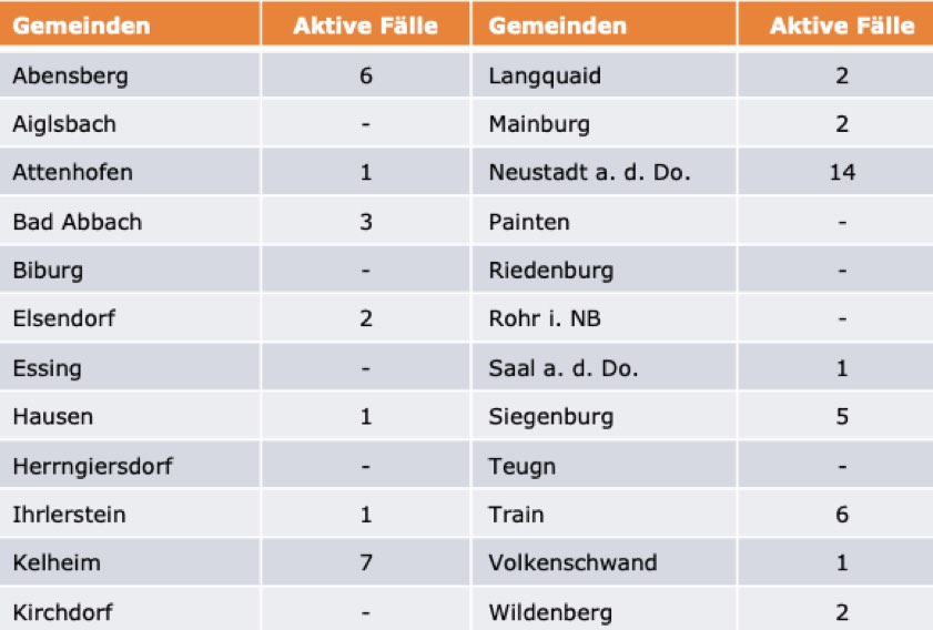 (ty) Im Kreis Kelheim gibt es in Zusammenhang mit der Corona-Pandemie, wie berichtet, mittlerweile 83 Menschenleben zu beklagen. Unter Verweis auf Daten des hiesigen Gesundheitsamts teilte das Landratsamt heute mit, dass – Stand heute, 0 Uhr – die Zahl der im Kreis Kelheim positiv auf den neuartigen Erreger getesteten Menschen bei insgesamt 3195 liegt – das sind vier mehr mehr als gestern gemeldet. Insgesamt 3058 hiesige Corona-Patienten (gestern: 3048) gelten mittlerweile als genesen und sind aus der Quarantäne entlassen. Derzeit gebe es 54 aktive Corona-Fälle im Landkreis Kelheim (gestrige Meldung: 60). Zahlen aus den einzelnen Gemeinden zeigt die Tabelle unten.