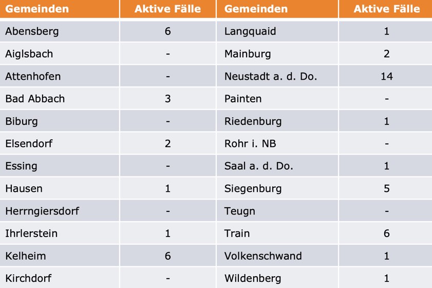(ty) Im Kreis Kelheim gibt es in Zusammenhang mit der Corona-Pandemie, wie berichtet, mittlerweile 83 Menschenleben zu beklagen. Unter Verweis auf Daten des hiesigen Gesundheitsamts teilte das Landratsamt heute mit, dass – Stand heute, 0 Uhr – die Zahl der im Kreis Kelheim positiv auf den neuartigen Erreger getesteten Menschen bei insgesamt 3198 liegt – das sind drei mehr mehr als gestern gemeldet. Insgesamt 3064 hiesige Corona-Patienten (gestern: 3058) gelten mittlerweile als genesen und sind aus der Quarantäne entlassen. Derzeit gebe es 51 aktive Corona-Fälle im Landkreis Kelheim (gestrige Meldung: 54). Zahlen aus den einzelnen Gemeinden zeigt die Tabelle unten.