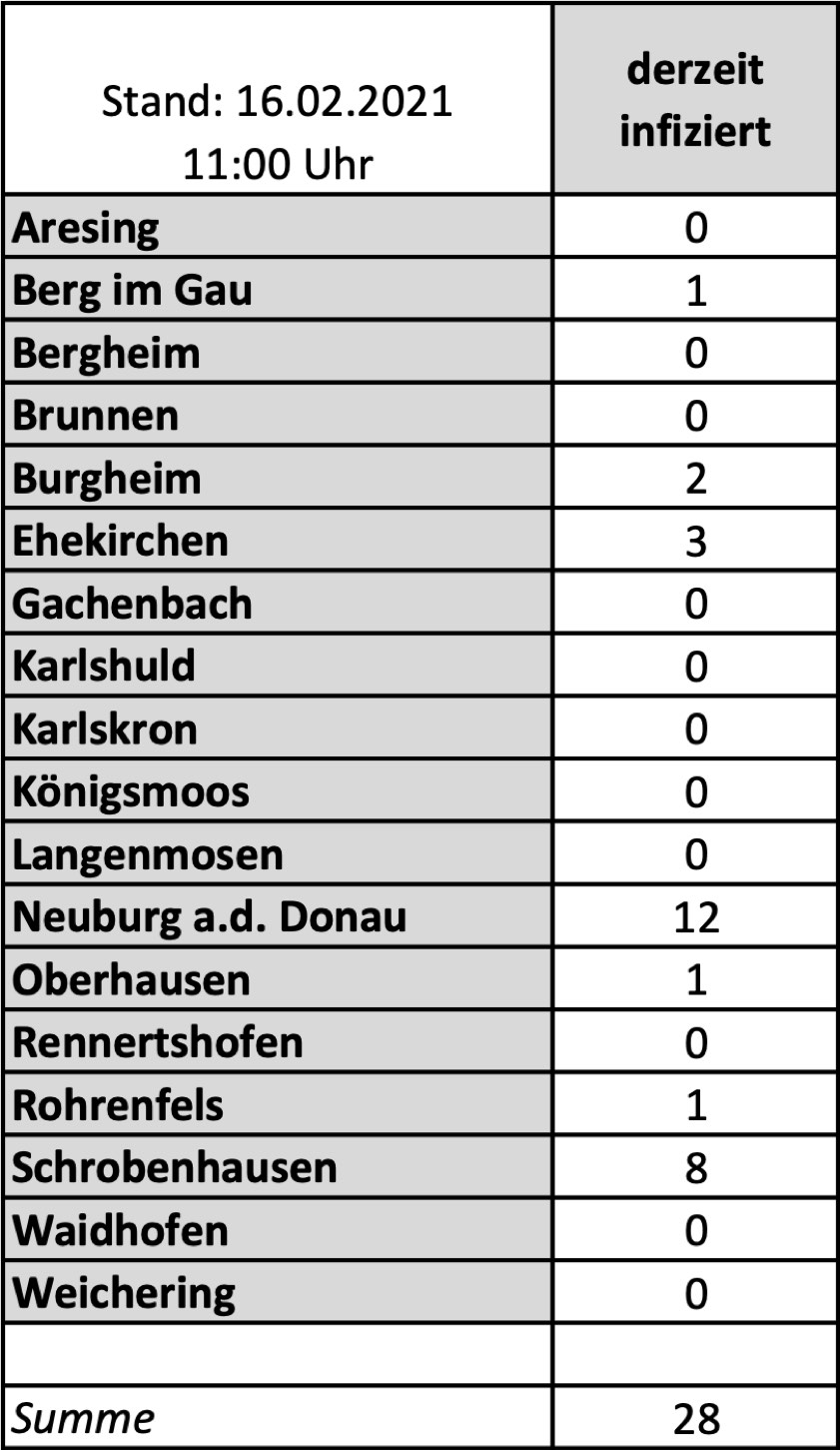 (ty) Im Kreis Neuburg-Schrobenhausen gibt es in Zusammenhang mit der Corona-Pandemie, wie berichtet, mittlerweile 64 Menschenleben zu beklagen. Die weitere Situation in dem Kreis stellt sich nach aktuellen Angaben des Landratsamts wie folgt dar: Bislang – Stand: heute, 11 Uhr – wurden 2727 Landkreis-Bürger positiv auf den neuartigen Erreger getestet. Die Zahl hat sich seit der gestrigen Meldung um zwei erhöht. Von den Infizierten gelten mittlerweile 2635 als genesen – das sind vier mehr als gestern. Momentan gibt es in dem Landkreis 28 aktive Corona-Fälle (gestern: 30). Aktuelle Zahlen aus den Gemeinden zeigt die Tabelle unten.