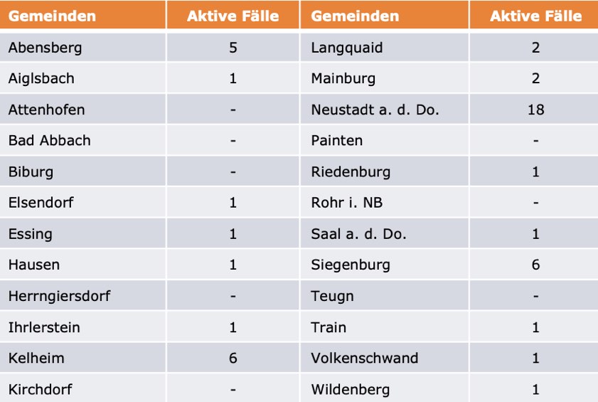 (ty) Im Kreis Kelheim gibt es in Zusammenhang mit der Corona-Pandemie bislang 82 Menschenleben zu beklagen. Das Landratsamt korrigierte die Zahl heute von 83 auf 82 und erklärte, dass eine infizierte Person zwar im Kreis Kelheim gestorben sei, aber ihren Wohnsitz nicht hier hatte. Unter Verweis auf Daten des hiesigen Gesundheitsamts teilte das Landratsamt heute mit, dass – Stand heute, 0 Uhr – die Zahl der im Kreis Kelheim positiv auf den neuartigen Erreger getesteten Menschen bei insgesamt 3212 liegt – das sind sieben mehr mehr als gestern gemeldet. Insgesamt 3081 hiesige Corona-Patienten (gestern: 3071) gelten mittlerweile als genesen und sind aus der Quarantäne entlassen. Derzeit gebe es 49 aktive Corona-Fälle im Landkreis Kelheim. Zahlen aus den einzelnen Gemeinden zeigt die Tabelle unten.