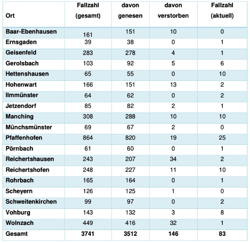 (ty) In Zusammenhang mit der Corona-Pandemie gibt es im Kreis Pfaffenhofen, wie berichtet, mittlerweile 146 Menschenleben zu beklagen. Das Landratsamt veröffentlicht eine tägliche Übersicht (siehe unten), in welchen Gemeinden die mit dem Virus infizierten Menschen, die gestorben sind, gelebt haben beziehungsweise wie viele bestätigte Infektionsfälle und genesene Patienten es in welcher Kommune gibt. Die Zahl der Landkreis-Bürger, die positiv auf den neuartigen Erreger getestet worden sind, hat sich seit der Meldung von gestern um vier erhöht und beträgt nunmehr 3741.