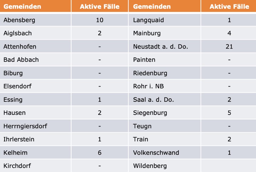 (ty) Im Kreis Kelheim gibt es in Zusammenhang mit der Corona-Pandemie, wie berichtet, bislang 82 Menschenleben zu beklagen. Unter Verweis auf Daten des hiesigen Gesundheitsamts teilte das Landratsamt heute mit, dass – Stand gestern, 16 Uhr – die Zahl der im Kreis Kelheim positiv auf den neuartigen Erreger getesteten Menschen bei insgesamt 3232 liegt – das sind drei mehr mehr als gestern gemeldet. Insgesamt 3092 hiesige Corona-Patienten (gestern: 3086) gelten mittlerweile als genesen und sind aus der Quarantäne entlassen. Derzeit gebe es 58 aktive Corona-Fälle (gestern: 61) im Landkreis Kelheim. Zahlen aus den einzelnen Gemeinden zeigt die Tabelle unten.