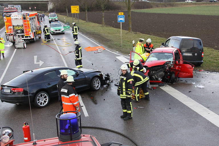 (ty) Zu einem schweren Unfall mit zwei Schwerverletzten und drei beteiligten Fahrzeugen kam es heute gegen 8.40 Uhr auf der B 16 in Höhe der Abzweigung nach Hagau. Eine 55-Jährige aus Neuburg wollte mit ihrem Pkw von Neuburg kommend nach links Richtung Hagau abbiegen, übersah dabei allerdings den Wagen eines entgegenkommenden 46-jährigen Ingolstädters. Es kam zu einem seitliche versetzten Frontalzusammenstoß, bei dem das Auto des Ingolstädters noch gegen einen wartenden Pkw geschleudert wurde. Der 46-jährige Ingolstädter kam mit schwersten Verletzungen ins Klinikum, die Unfallverursacherin wurde ebenfalls schwer verletzt ins Neuburger Krankenhaus eingeliefert. Die 45-jährige Fahrerin des dritten Autos kam mit leichteren Verletzungen davon.