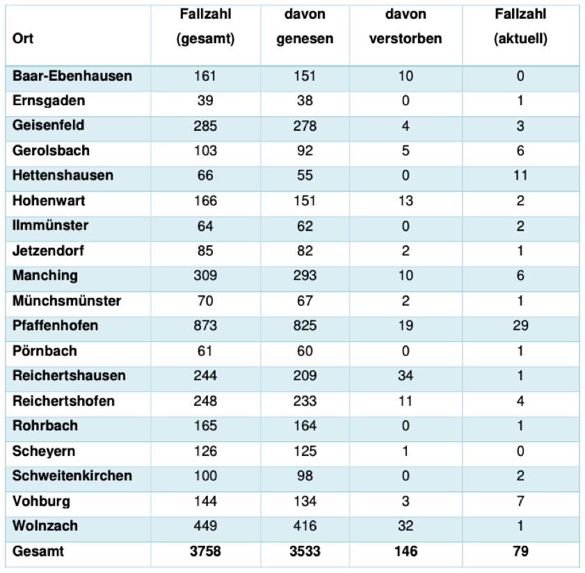 (ty) In Zusammenhang mit der Corona-Pandemie gibt es im Kreis Pfaffenhofen, wie berichtet, mittlerweile 146 Menschenleben zu beklagen. Das Landratsamt veröffentlicht eine tägliche Übersicht (siehe unten), in welchen Gemeinden die mit dem Virus infizierten Menschen, die gestorben sind, gelebt haben beziehungsweise wie viele bestätigte Infektionsfälle und genesene Patienten es in welcher Kommune gibt. Die Zahl der Landkreis-Bürger, die positiv auf den neuartigen Erreger getestet worden sind, hat sich seit der Meldung von gestern um einen erhöht und beträgt nunmehr 3758.