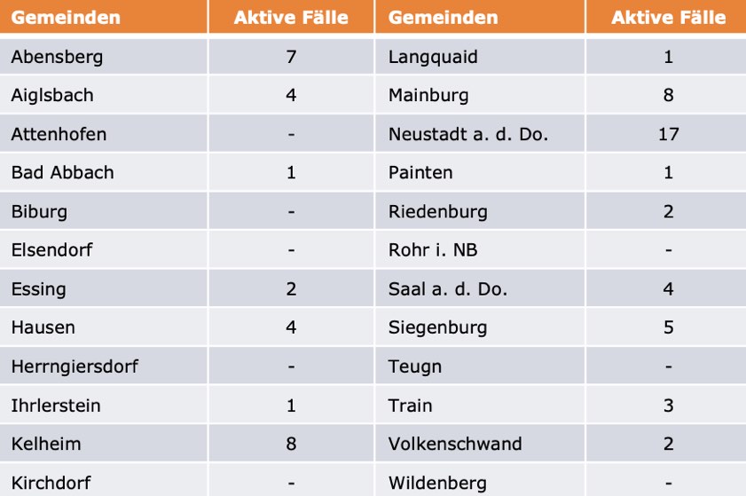 (ty) Im Kreis Kelheim gibt es in Zusammenhang mit der Corona-Pandemie, wie berichtet, bislang 82 Menschenleben zu beklagen. Unter Verweis auf Daten des hiesigen Gesundheitsamts teilte das Landratsamt heute mit, dass – Stand gestern, 16 Uhr – die Zahl der im Kreis Kelheim positiv auf den neuartigen Erreger getesteten Menschen bei insgesamt 3259 liegt – das sind 13 mehr als gestern gemeldet. Insgesamt 3107 hiesige Corona-Patienten (gestern: 3107) gelten mittlerweile als genesen und sind aus der Quarantäne entlassen. Derzeit gebe es 70 aktive Corona-Fälle (gestern: 57) im Landkreis Kelheim. Zahlen aus den einzelnen Gemeinden zeigt die Tabelle unten.