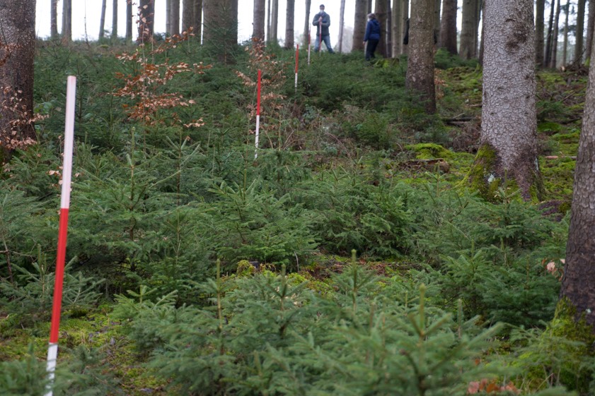 In einer Aufnahme-Geraden der Verjüngungs-Inventur werden fünf zu begutachtende Punkte durch Fluchtstäbe markiert.