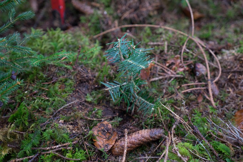 "Hier gut zu erkennen", erklärt das AELF: "Der durch Rehwild sauber abgezwickte Wuchstrieb an der kleinen Tanne. Der Fachbegriff dafür lautet: Verbiss."