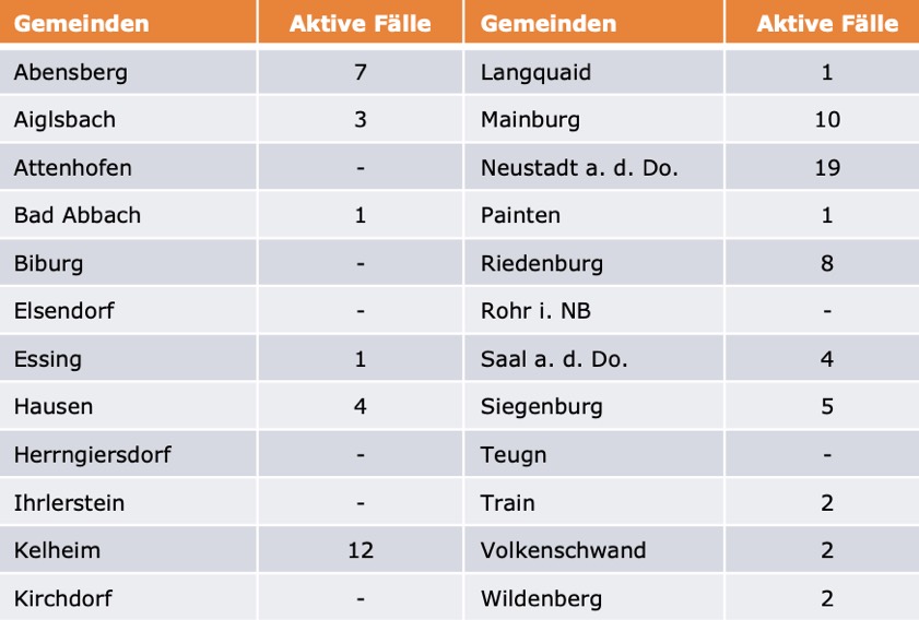 (ty) Im Kreis Kelheim gibt es in Zusammenhang mit der Corona-Pandemie, wie berichtet, bislang 82 Menschenleben zu beklagen. Unter Verweis auf Daten des hiesigen Gesundheitsamts teilte das Landratsamt heute mit, dass – Stand gestern, 16 Uhr – die Zahl der im Kreis Kelheim positiv auf den neuartigen Erreger getesteten Menschen bei insgesamt 3281 liegt – das sind zwölf mehr als gestern gemeldet. Insgesamt 3117 hiesige Corona-Patienten (gestern: 3110) gelten mittlerweile als genesen und sind aus der Quarantäne entlassen. Derzeit gebe es 82 aktive Corona-Fälle (gestern: 77) im Landkreis Kelheim. Zahlen aus den einzelnen Gemeinden zeigt die Tabelle unten.