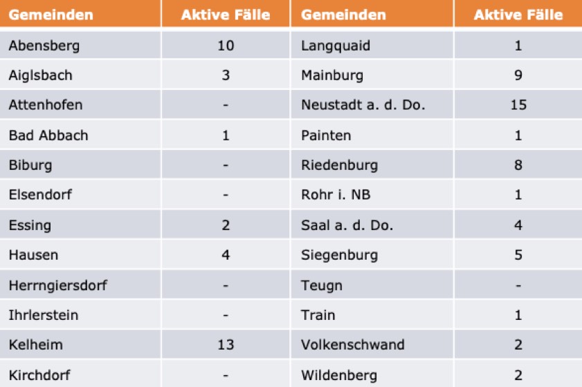 (ty) Im Kreis Kelheim gibt es in Zusammenhang mit der Corona-Pandemie, wie berichtet, bislang 82 Menschenleben zu beklagen. Unter Verweis auf Daten des hiesigen Gesundheitsamts teilte das Landratsamt heute mit, dass – Stand gestern, 16 Uhr – die Zahl der im Kreis Kelheim positiv auf den neuartigen Erreger getesteten Menschen bei insgesamt 3292 liegt – das sind elf mehr als am Samstag gemeldet. Insgesamt 3128 hiesige Corona-Patienten (Samstag: 3117) gelten mittlerweile als genesen und sind aus der Quarantäne entlassen. Derzeit gebe es 82 aktive Corona-Fälle (Samstag: 82) im Landkreis Kelheim. Zahlen aus den einzelnen Gemeinden zeigt die Tabelle unten.