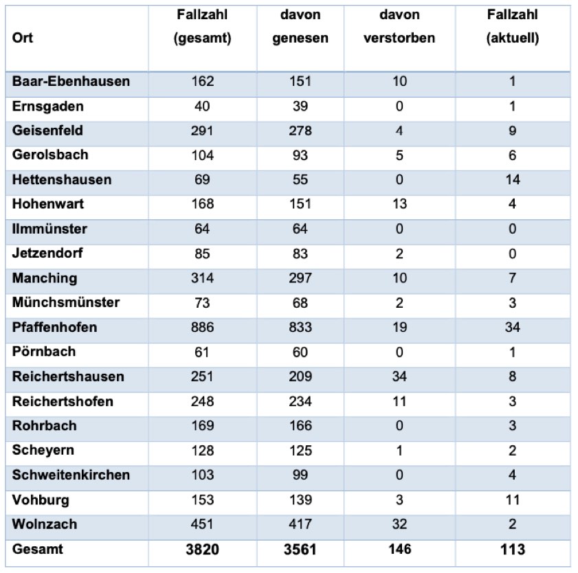 (ty) In Zusammenhang mit der Corona-Pandemie gibt es im Kreis Pfaffenhofen, wie berichtet, mittlerweile 146 Menschenleben zu beklagen. Das Landratsamt veröffentlicht eine tägliche Übersicht (siehe unten), in welchen Gemeinden die mit dem Virus infizierten Menschen, die gestorben sind, gelebt haben beziehungsweise wie viele bestätigte Infektionsfälle und genesene Patienten es in welcher Kommune gibt. Die Zahl der Landkreis-Bürger, die positiv auf den neuartigen Erreger getestet worden sind, hat sich seit der Meldung von gestern um sechs erhöht und beträgt somit jetzt 3820.