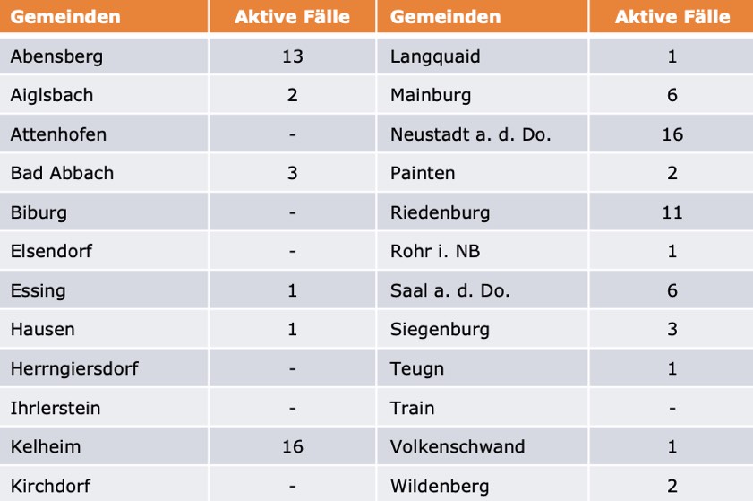 (ty) Im Kreis Kelheim gibt es in Zusammenhang mit der Corona-Pandemie, wie berichtet, mittlerweile 83 Menschenleben zu beklagen. Unter Verweis auf Daten des hiesigen Gesundheitsamts teilte das Landratsamt heute mit, dass – Stand gestern, 16 Uhr – die Zahl der im Kreis Kelheim positiv auf den neuartigen Erreger getesteten Menschen bei insgesamt 3317 liegt – das sind zwölf mehr als gestern gemeldet. Insgesamt 3148 hiesige Corona-Patienten (gestern: 3148) gelten mittlerweile als genesen und sind aus der Quarantäne entlassen. Derzeit gebe es 86 aktive Corona-Fälle (gestern: 74) im Landkreis Kelheim. Zahlen aus den einzelnen Gemeinden zeigt die Tabelle unten.