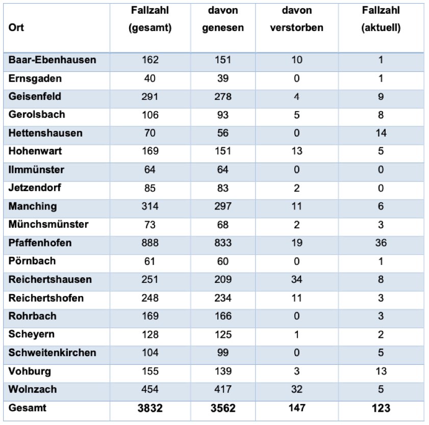 (ty) In Zusammenhang mit der Corona-Pandemie gibt es im Kreis Pfaffenhofen ein weiteres Menschenleben zu beklagen. Wie das Landratsamt heute mitteilte, ist ein 81 Jahre alter Mann aus der Gemeinde Manching gestorben, der mit dem Erreger infiziert war. Damit erhöht sich die Zahl der mit dem Virus infizierten Landkreis-Bürger, die gestorben sind, auf nunmehr 147. Das Landratsamt veröffentlicht eine tägliche Übersicht (siehe unten), in welchen Gemeinden die mit dem Virus infizierten Menschen, die gestorben sind, gelebt haben beziehungsweise wie viele bestätigte Infektionsfälle und genesene Patienten es in welcher Kommune gibt. Die Zahl der Landkreis-Bürger, die positiv auf den neuartigen Erreger getestet worden sind, hat sich seit der Meldung von gestern um zwölf erhöht und beträgt somit jetzt 3832.