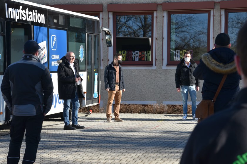 Pro Tag werden laut Angaben des Landratsamts in Zusammenhang mit dem Impf-Bus – je nach Verfügbarkeit von Impfstoff – 100 Corona-Impfungen möglich sein, die durch die mobilen Teams der "Aicher-Group" durchgeführt werden. Um dieses Vorhaben reibungslos umsetzen zu können, simulierten am heutigen Samstag rund 20 Probanden den Ablauf an der Grundschule von Painten. Neben Vertretern des "Impf-Zentrum Bayern" (Betreiber des stationären Impf-Zentrums in Kelheim und der beiden geplanten Außenstellen), der "Aicher-Group" und des Landratsamts waren auch Landrat Martin Neumeyer und der Paintener Bürgermeister Michael Raßhofer vor Ort.