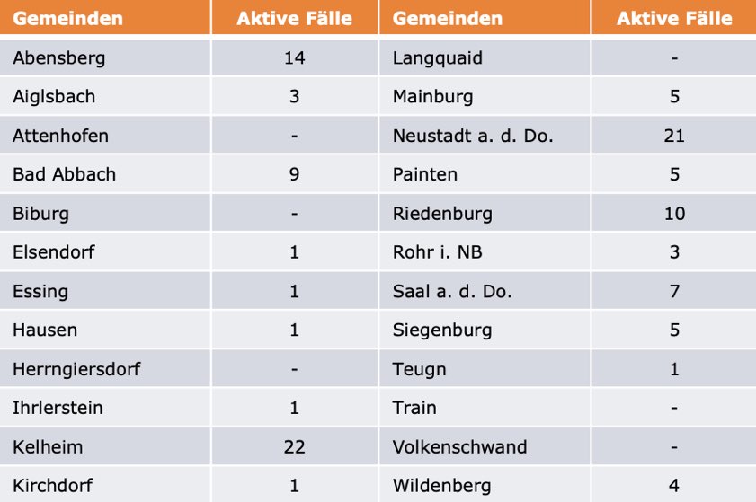 (ty) Im Kreis Kelheim gibt es in Zusammenhang mit der Corona-Pandemie, wie berichtet, mittlerweile 83 Menschenleben zu beklagen. Unter Verweis auf Daten des hiesigen Gesundheitsamts teilte das Landratsamt heute mit, dass – Stand gestern, 16 Uhr – die Zahl der im Kreis Kelheim positiv auf den neuartigen Erreger getesteten Menschen bei insgesamt 3354 liegt – das sind sieben mehr als gestern gemeldet. Insgesamt 3157 hiesige Corona-Patienten (gestern: 3153) gelten mittlerweile als genesen und sind aus der Quarantäne entlassen. Derzeit gebe es 114 aktive Corona-Fälle (gestern: 111) im Landkreis Kelheim. Zahlen aus den einzelnen Gemeinden zeigt die Tabelle unten.