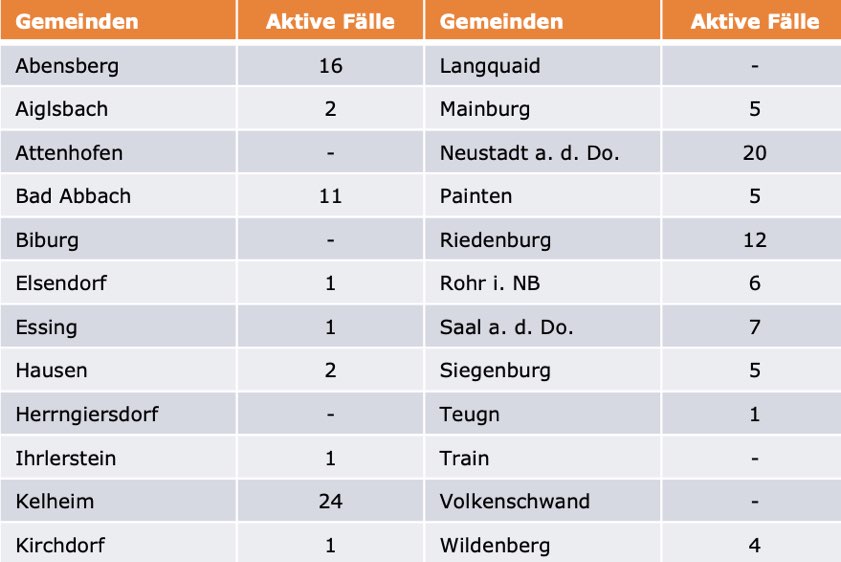 (ty) Im Kreis Kelheim gibt es in Zusammenhang mit der Corona-Pandemie, wie berichtet, mittlerweile 83 Menschenleben zu beklagen. Unter Verweis auf Daten des hiesigen Gesundheitsamts teilte das Landratsamt heute mit, dass – Stand gestern, 16 Uhr – die Zahl der im Kreis Kelheim positiv auf den neuartigen Erreger getesteten Menschen bei insgesamt 3372 liegt – das sind elf mehr als gestern gemeldet. Insgesamt 3165 hiesige Corona-Patienten (gestern: 3164) gelten mittlerweile als genesen und sind aus der Quarantäne entlassen. Derzeit gebe es 124 aktive Corona-Fälle (gestern: 114) im Landkreis Kelheim. Zahlen aus den einzelnen Gemeinden zeigt die Tabelle unten.