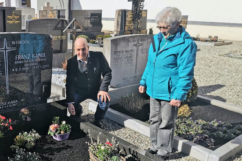 Zum 80. Geburtstag des bereits 2014 verstorbenen Vereinsgründers und Kommunalpolitikers Franz Kaindl legte BCU-Ehrenvorsitzender Wolfgang Inderwies einen Blumengruß an dessen Grab nieder. Rechts im Bild: Franz Kaindls Witwe Rosa.