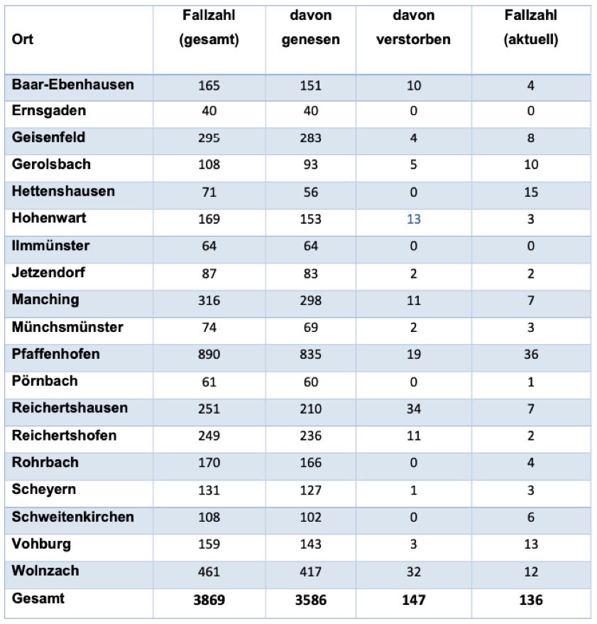 Von den bislang insgesamt 3869 Menschen aus dem Kreis Pfaffenhofen, bei denen nach jüngstem offiziellen Stand eine Corona-Infektion bestätigt worden ist, gelten laut aktueller Mitteilung der Behörde mittlerweile 3586 als genesen – das sind zwei mehr als gestern gemeldet. Die Zahl der Infizierten und noch nicht genesenen Corona-Patienten hat sich damit im Landkreis erhöht und beträgt – Stand: heute Nachmittag – derzeit 136 (gestern: 130). Die infizierten Personen befinden sich in häuslicher Isolation.