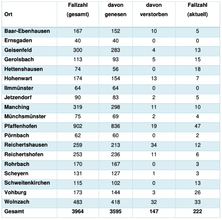 Von den bislang insgesamt 3964 Menschen aus dem Kreis Pfaffenhofen, bei denen nach jüngstem offiziellen Stand eine Corona-Infektion bestätigt worden ist, gelten laut aktueller Mitteilung der Behörde mittlerweile 3595 als genesen – das ist eine Person mehr als gestern gemeldet. Die Zahl der Infizierten und noch nicht genesenen Corona-Patienten hat sich damit im Landkreis leicht erhöht und beträgt – Stand: heute Nachmittag – derzeit 222 (gestern: 219). Die infizierten Personen befinden sich in häuslicher Isolation.