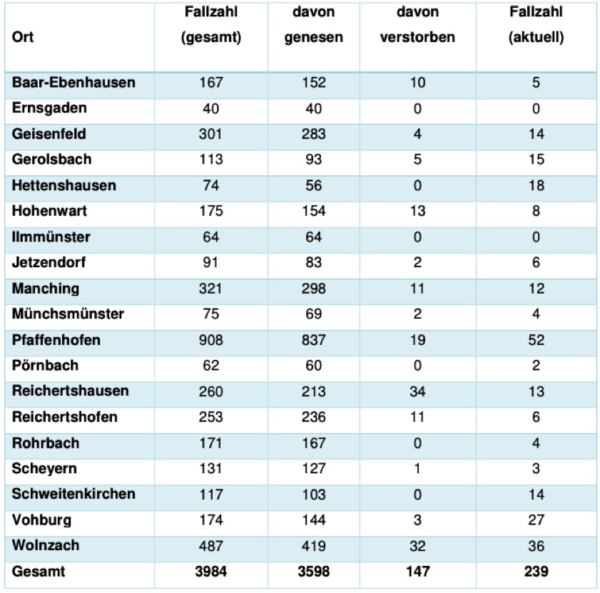 Von den bislang insgesamt 3984 Menschen aus dem Kreis Pfaffenhofen, bei denen nach jüngstem offiziellen Stand eine Corona-Infektion bestätigt worden ist, gelten laut aktueller Mitteilung der Behörde mittlerweile 3598 als genesen – das sind drei mehr als gestern gemeldet. Die Zahl der Infizierten und noch nicht genesenen Corona-Patienten hat sich damit im Landkreis deutlich erhöht und beträgt – Stand: heute Nachmittag – derzeit 239 (gestern: 222). Die infizierten Personen befinden sich in häuslicher Isolation.