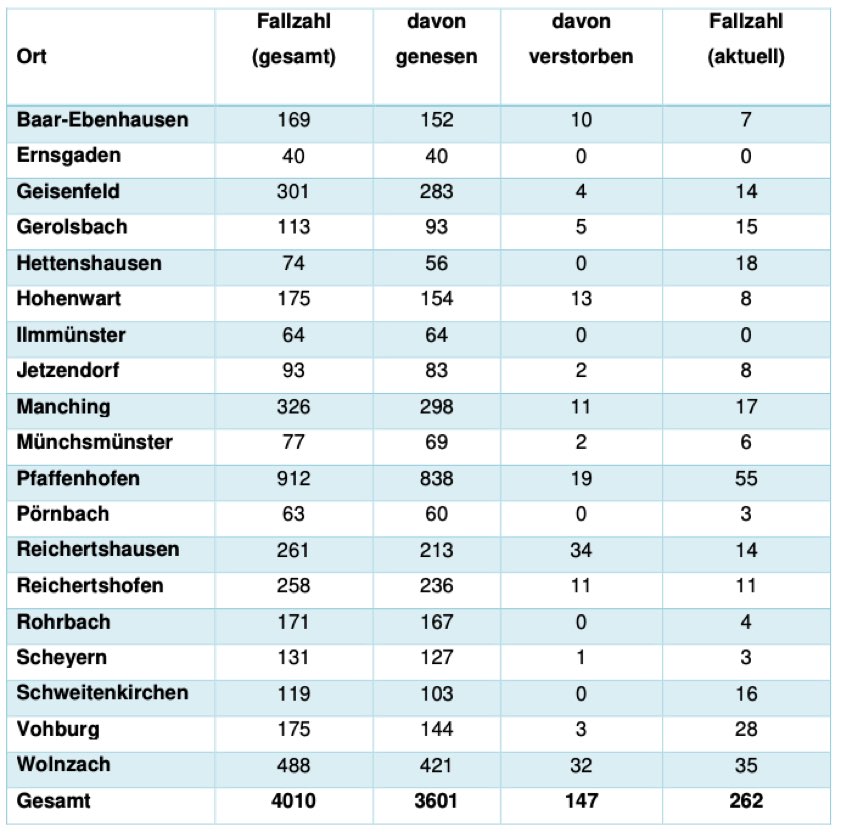 Von den bislang insgesamt 4010 Menschen aus dem Kreis Pfaffenhofen, bei denen nach jüngstem offiziellen Stand eine Corona-Infektion bestätigt worden ist, gelten laut aktueller Mitteilung der Behörde mittlerweile 3601 als genesen – das sind drei mehr als gestern gemeldet. Die Zahl der Infizierten und noch nicht genesenen Corona-Patienten hat sich damit im Landkreis deutlich erhöht und beträgt – Stand: heute Nachmittag – derzeit 262 (gestern: 239). Die infizierten Personen befinden sich in häuslicher Isolation.