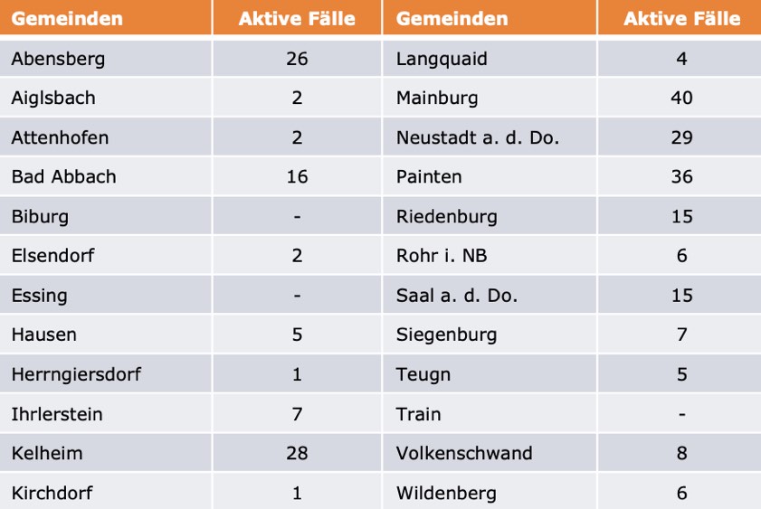 (ty) Im Kreis Kelheim gibt es in Zusammenhang mit der Corona-Pandemie, wie berichtet, mittlerweile 83 Menschenleben zu beklagen. Unter Verweis auf Daten des hiesigen Gesundheitsamts teilte das Landratsamt heute mit, dass – Stand gestern, 16 Uhr – die Zahl der im Kreis Kelheim positiv auf den neuartigen Erreger getesteten Menschen bei insgesamt 3689 liegt – das sind 25 mehr als gestern gemeldet. Insgesamt 3345 hiesige Corona-Patienten (gestern: 3332) gelten mittlerweile als genesen und sind aus der Quarantäne entlassen. Derzeit gebe es 261 aktive Corona-Fälle (gestern: 249) im Landkreis. Zahlen aus den einzelnen Gemeinden zeigt die Tabelle unten. Wegen der hohen Inzidenz-Werte gelten seit 20. März wieder die strengen Regeln wie vor dem 8. März – darunter eine nächtliche Ausgangssperre. Nur Abschluss-Klassen haben ab dem heutigen Montag Präsenz-Unterricht, alle anderen Schüler erhalten Distanz-Unterricht. Kitas bleiben geschlossen.