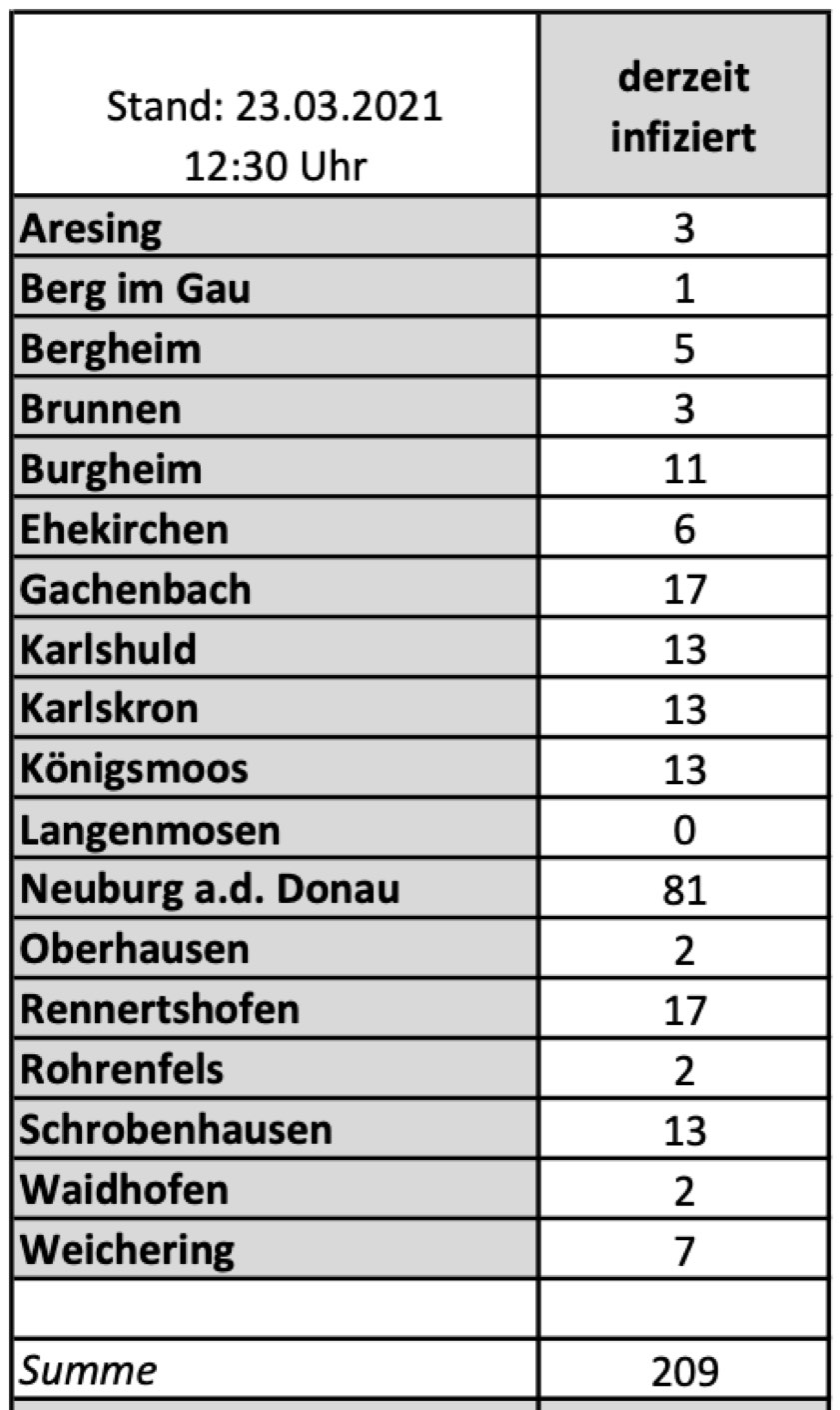 (ty) Im Kreis Neuburg-Schrobenhausen gibt es in Zusammenhang mit der Corona-Pandemie, wie berichtet, mittlerweile 65 Menschenleben zu beklagen. Die weitere Situation in dem Kreis stellt sich nach aktuellen Angaben des Landratsamts wie folgt dar: Bislang – Stand: heute, 12.30 Uhr – wurden 3011 Landkreis-Bürger positiv auf den neuartigen Erreger getestet. Die Zahl hat sich seit der gestrigen Meldung um 22 erhöht. Von den Infizierten gelten mittlerweile 2737 als genesen – unverändert seit gestern. Momentan gibt es in dem Landkreis 209 aktive Corona-Fälle (gestern: 187). Aktuelle Zahlen aus den Gemeinden zeigt die Tabelle unten. Weil die Sieben-Tages-Inzidenz mehrere Tage in Folge über 50 lag, gelten mittlerweile neue Corona-Regeln; lesen Sie dazu: Kreis Neuburg-Schrobenhausen: Diese neuen Corona-Regeln gelten ab 17. März