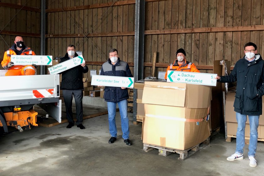 Nachdem die Gemeinde Karlsfeld als erste Landkreis-Gemeinde ihr Beschilderungs-Material erhalten hatte (Foto oben), werden auch die anderen Gemeinden im Landkreis rund um Ostern ihre Beschilderungs-Sätze bekommen. Die Beschaffung des Schilder-Materials wurde durch den Landkreis im Rahmen des Radverkehrs-Konzepts koordiniert und finanziert. Hierfür habe der Landkreis vom Bundesministerium für Umwelt, Naturschutz und nukleare Sicherheit eine Förderung von 40 Prozent erhalten.