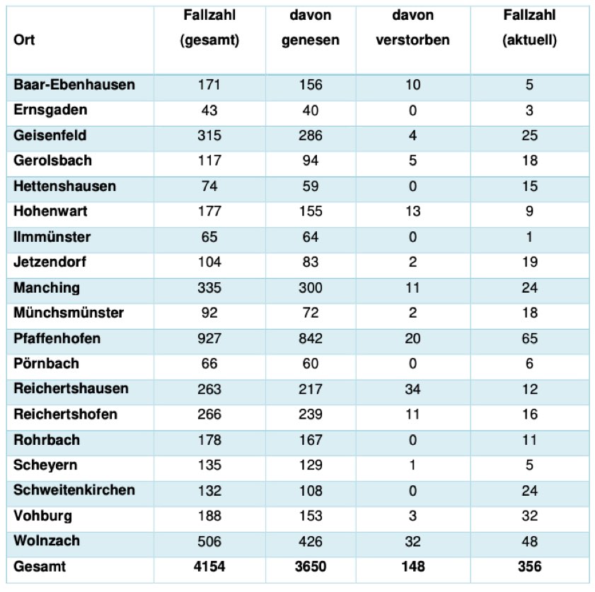 Von den bislang insgesamt 4154 Menschen aus dem Kreis Pfaffenhofen, bei denen nach jüngstem offiziellen Stand eine Corona-Infektion bestätigt worden ist, gelten laut aktueller Mitteilung der Behörde mittlerweile 3650 als genesen – das sind 18 mehr als gestern gemeldet. Die Zahl der Infizierten und noch nicht genesenen Corona-Patienten hat sich damit im Landkreis weiter erhöht und beträgt – Stand: heute Mittag – derzeit 356 (gestern: 351). Die infizierten Personen befinden sich in häuslicher Isolation.