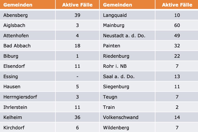 (ty) Im Kreis Kelheim gibt es in Zusammenhang mit der Corona-Pandemie, wie berichtet, mittlerweile 83 Menschenleben zu beklagen. Unter Verweis auf Daten des hiesigen Gesundheitsamts teilte das Landratsamt heute mit, dass – Stand gestern, 16 Uhr – die Zahl der im Kreis Kelheim positiv auf den neuartigen Erreger getesteten Menschen bei insgesamt 3858 liegt – das sind 55 mehr als gestern gemeldet. Insgesamt 3404 hiesige Corona-Patienten (gestern: 3388) gelten mittlerweile als genesen und sind aus der Quarantäne entlassen. Derzeit gebe es 371 aktive Corona-Fälle (gestern: 332) im Landkreis. Zahlen aus den einzelnen Gemeinden zeigt die Tabelle unten. Wegen der hohen Inzidenz-Werte gelten seit 20. März wieder die strengen Regeln wie vor dem 8. März – darunter eine nächtliche Ausgangssperre. Nur Abschluss-Klassen haben diese Woche Präsenz-Unterricht, alle anderen Schüler erhalten Distanz-Unterricht. Kitas bleiben geschlossen.