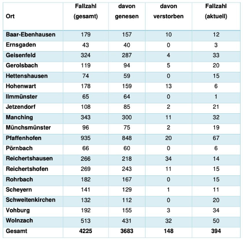 Von den bislang insgesamt 4225 Menschen aus dem Kreis Pfaffenhofen, bei denen nach jüngstem offiziellen Stand eine Corona-Infektion bestätigt worden ist, gelten laut aktueller Mitteilung der Behörde mittlerweile 3683 als genesen – das sind 20 mehr als gestern gemeldet. Die Zahl der Infizierten und noch nicht genesenen Corona-Patienten hat sich damit im Landkreis deutlich erhöht und beträgt – Stand: heute Mittag – derzeit 394 (gestern: 383). Die infizierten Personen befinden sich in häuslicher Isolation.
