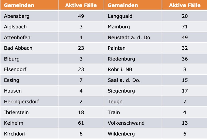 (ty) Im Kreis Kelheim gibt es in Zusammenhang mit der Corona-Pandemie, wie berichtet, mittlerweile 83 Menschenleben zu beklagen. Unter Verweis auf Daten des hiesigen Gesundheitsamts teilte das Landratsamt heute mit, dass – Stand gestern, 16 Uhr – die Zahl der im Kreis Kelheim positiv auf den neuartigen Erreger getesteten Menschen bei insgesamt 4036 liegt – das sind 74 mehr als gestern gemeldet. Insgesamt 3472 hiesige Corona-Patienten (gestern: 3448) gelten mittlerweile als genesen und sind aus der Quarantäne entlassen. Derzeit gebe es 481 aktive Corona-Fälle (gestern: 431) im Landkreis. Zahlen aus den einzelnen Gemeinden zeigt die Tabelle unten. Angesichts der hohen Inzidenz-Werte gelten seit 20. März wegen der Corona-Notbremse wieder die strengen Regeln wie vor dem 8. März – darunter eine nächtliche Ausgangssperre.