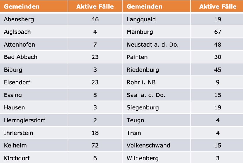(ty) Im Kreis Kelheim gibt es in Zusammenhang mit der Corona-Pandemie, wie berichtet, mittlerweile 83 Menschenleben zu beklagen. Unter Verweis auf Daten des hiesigen Gesundheitsamts teilte das Landratsamt heute mit, dass – Stand gestern, 16 Uhr – die Zahl der im Kreis Kelheim positiv auf den neuartigen Erreger getesteten Menschen bei insgesamt 4084 liegt – das sind 48 mehr als gestern gemeldet. Insgesamt 3508 hiesige Corona-Patienten (gestern: 3472) gelten mittlerweile als genesen und sind aus der Quarantäne entlassen. Derzeit gebe es 493 aktive Corona-Fälle (gestern: 481) im Landkreis. Zahlen aus den einzelnen Gemeinden zeigt die Tabelle unten. Angesichts der hohen Inzidenz-Werte gelten seit 20. März wegen der Corona-Notbremse wieder die strengen Regeln wie vor dem 8. März – darunter eine nächtliche Ausgangssperre.
