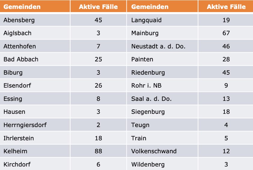 (ty) Im Kreis Kelheim gibt es in Zusammenhang mit der Corona-Pandemie, vier weitere Menschenleben zu beklagen. Wie heute gemeldet wurde, sind in den vergangenen Tagen drei Männer (Jahrgang 1961, 1951, 1930) und eine Frau (Jahrgang 1949) gestorben, die mit dem Virus infiziert waren und jeweils unter Vorerkrankungen litten. Damit erhöht sich die Zahl der mit dem Erreger infizierten Landkreis-Bürger, die gestorben sind, auf 87. Unter Verweis auf Daten des Gesundheitsamts teilte das Landratsamt heute mit, dass – Stand gestern, 16 Uhr – die Zahl der im Kreis Kelheim positiv auf den neuartigen Erreger getesteten Menschen bei insgesamt 4128 liegt – das sind 44 mehr als gestern gemeldet. Insgesamt 3538 hiesige Corona-Patienten (gestern: 3508) gelten mittlerweile als genesen und sind aus der Quarantäne entlassen. Derzeit gebe es 503 aktive Corona-Fälle (gestern: 493) im Landkreis. Zahlen aus den einzelnen Gemeinden zeigt die Tabelle unten. Angesichts der hohen Inzidenz-Werte gelten seit 20. März wegen der Corona-Notbremse wieder die strengen Regeln wie vor dem 8. März – darunter eine nächtliche Ausgangssperre.