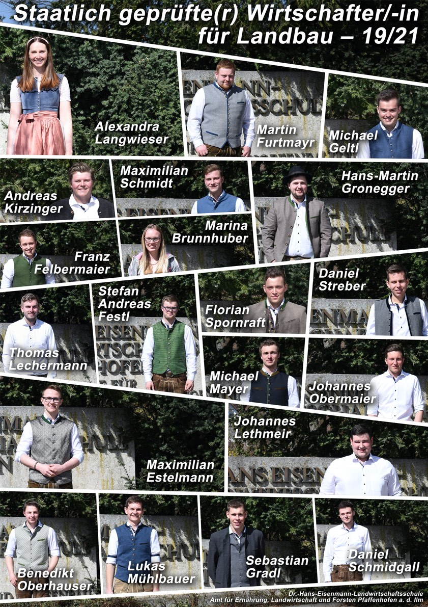(ty) In diesem Jahr haben 20 Studierende aus acht Landkreisen an der Dr.-Hans-Eisenmann-Landwirtschaftsschule in Pfaffenhofen ihre Fortbildung zum staatlich geprüften Wirtschafter beziehungsweise zur staatlich geprüften Wirtschafterin für Landbau (Bachelor Professional) erfolgreich abgeschlossen. "Bei einem Abschluss-Gottesdienst in der Pfaffenhofener Stadtpfarrkirche erhielten die 18 junge Männer und zwei Frauen aus der Hand von Schulleiterin Petra Praum ihre Zeugnisse", wie heute aus dem Amt für Ernährung, Landwirtschaft und Forsten (AELF) in Pfaffenhofen mitgeteilt wurde. Foto und die Namen aller Absolventen finden Sie am Ende dieses Beitrags.