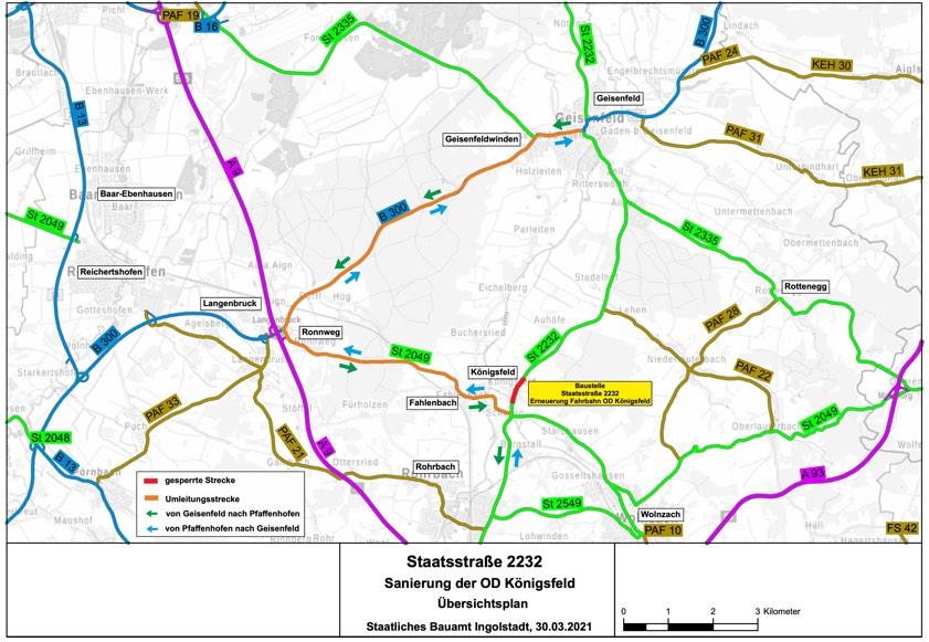 (ty) Das staatliche Bauamt in Ingolstadt plant derzeit die Sanierung der Ortsdurchfahrt von Wolnzach-Königsfeld – dabei es geht es um die viel befahrene Staatsstraße 2232 zwischen Pfaffenhofen und Geisenfeld. Die Autofahrer müssen deshalb nicht unerhebliche Umleitungs-Strecken (siehe offizielle Übersichts-Karte unten) in Kauf nehmen. Die anvisierten Bauarbeiten werden laut Behörden-Angaben ab dem kommenden Dienstag, 6. April, durchgeführt und dauern voraussichtlich bis Montag, 12. April.