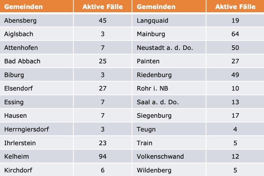 (ty) Im Kreis Kelheim gibt es in Zusammenhang mit der Corona-Pandemie, wie berichtet, mittlerweile 87 Menschenleben zu beklagen. Unter Verweis auf Daten des Gesundheitsamts teilte das Landratsamt heute mit, dass – Stand gestern, 16 Uhr – die Zahl der im Kreis Kelheim positiv auf den neuartigen Erreger getesteten Menschen bei insgesamt 4179 liegt – das sind 51 mehr als gestern gemeldet. Insgesamt 3567 hiesige Corona-Patienten (gestern: 3538) gelten mittlerweile als genesen und sind aus der Quarantäne entlassen. Derzeit gebe es 525 aktive Corona-Fälle (gestern: 503) im Landkreis. Zahlen aus den einzelnen Gemeinden zeigt die Tabelle unten. Angesichts der hohen Inzidenz-Werte gelten seit 20. März wegen der Corona-Notbremse wieder die strengen Regeln wie vor dem 8. März – darunter eine nächtliche Ausgangssperre.